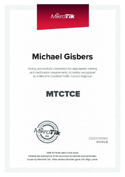 Mit Abschluss des Kurses MikroTik MTCNA (MikroTik Certified Network Associate) bei der FMS Internetservices GmbH in Freiburg ist Michael Gisbers nun auch zertifiziert.